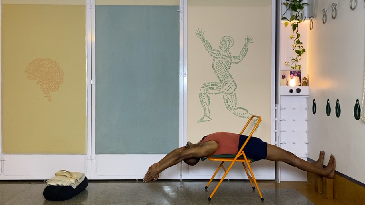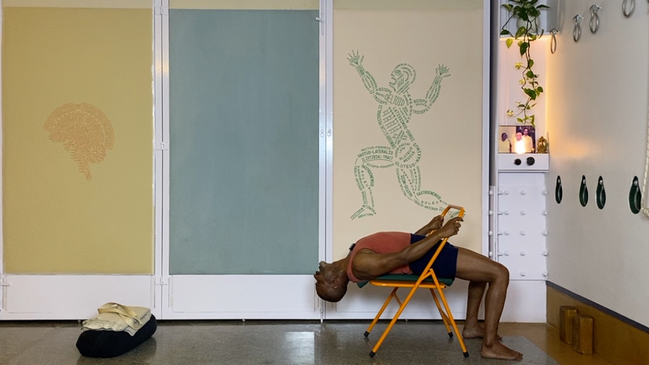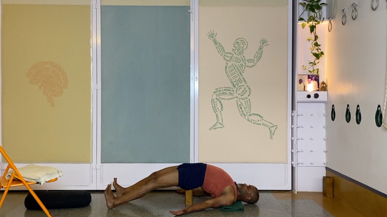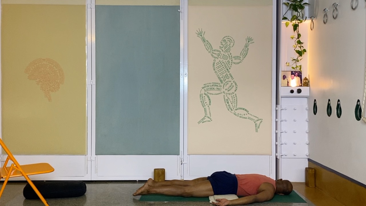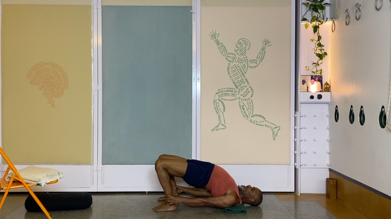 Next time you attempt arching back (not necessarily in a asana, but even a causal standing back arch, place a palm on your abdomen.  you will likely notice that the abdomen becomes hard. this is not desirable.  In an asana, definitely hardening and bloating of the abdominal area is not a desirable condition, but even physiologically, a hard abdomen can cause many kinds of disturbances.  But keeping the abdomen soft while arching back is definitely a challenge.  this session attempts to do this through a series of gentle actions that activates the deeper abdominal muscles, and connects the abdomen to the limbs (the arms and the legs).  The session ends with supported back arches.