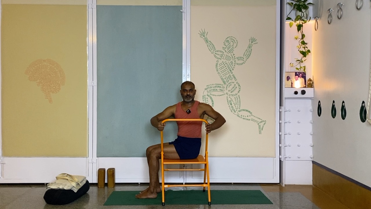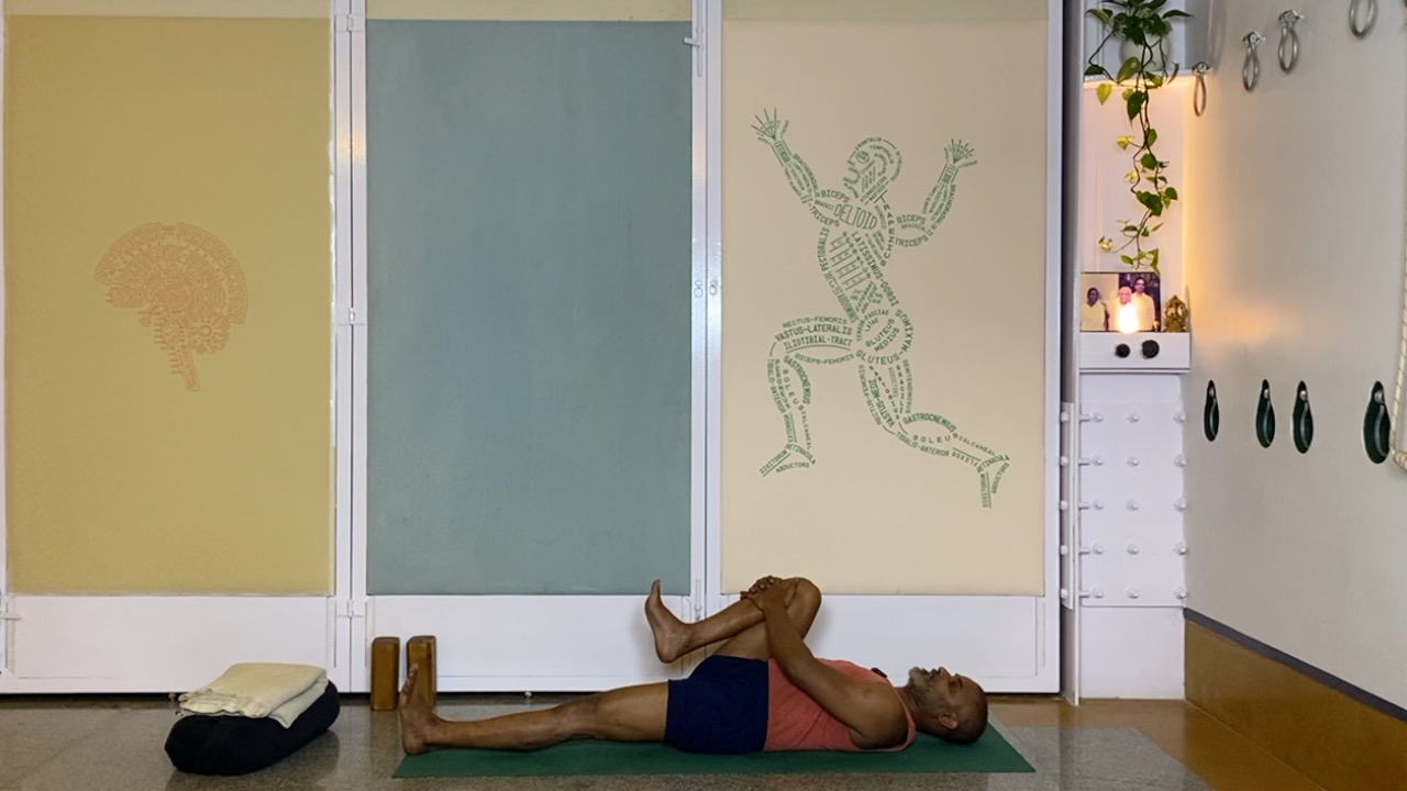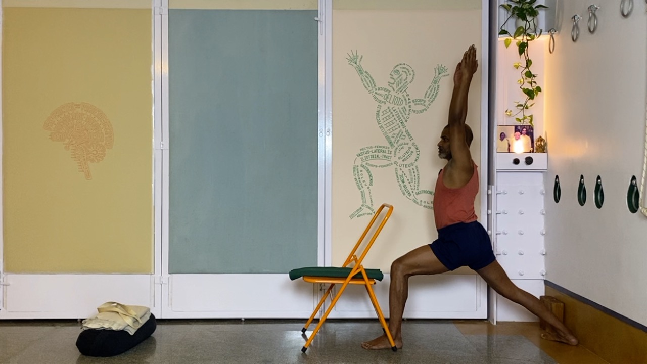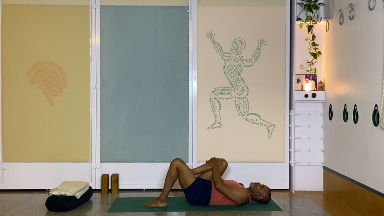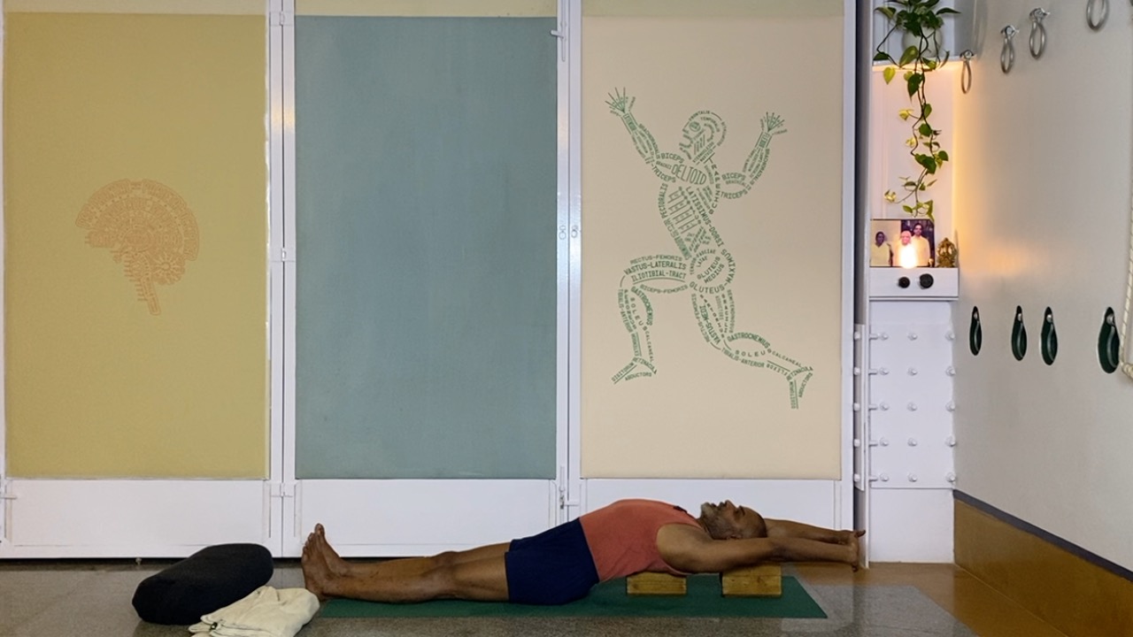Next time you attempt arching back (not necessarily in a asana, but even a causal standing back arch, place a palm on your abdomen.  you will likely notice that the abdomen becomes hard. this is not desirable.  In an asana, definitely hardening and bloating of the abdominal area is not a desirable condition, but even physiologically, a hard abdomen can cause many kinds of disturbances.  But keeping the abdomen soft while arching back is definitely a challenge.  this session attempts to do this through a series of gentle actions that activates the deeper abdominal muscles, and connects the abdomen to the limbs (the arms and the legs).  The session ends with supported back arches.