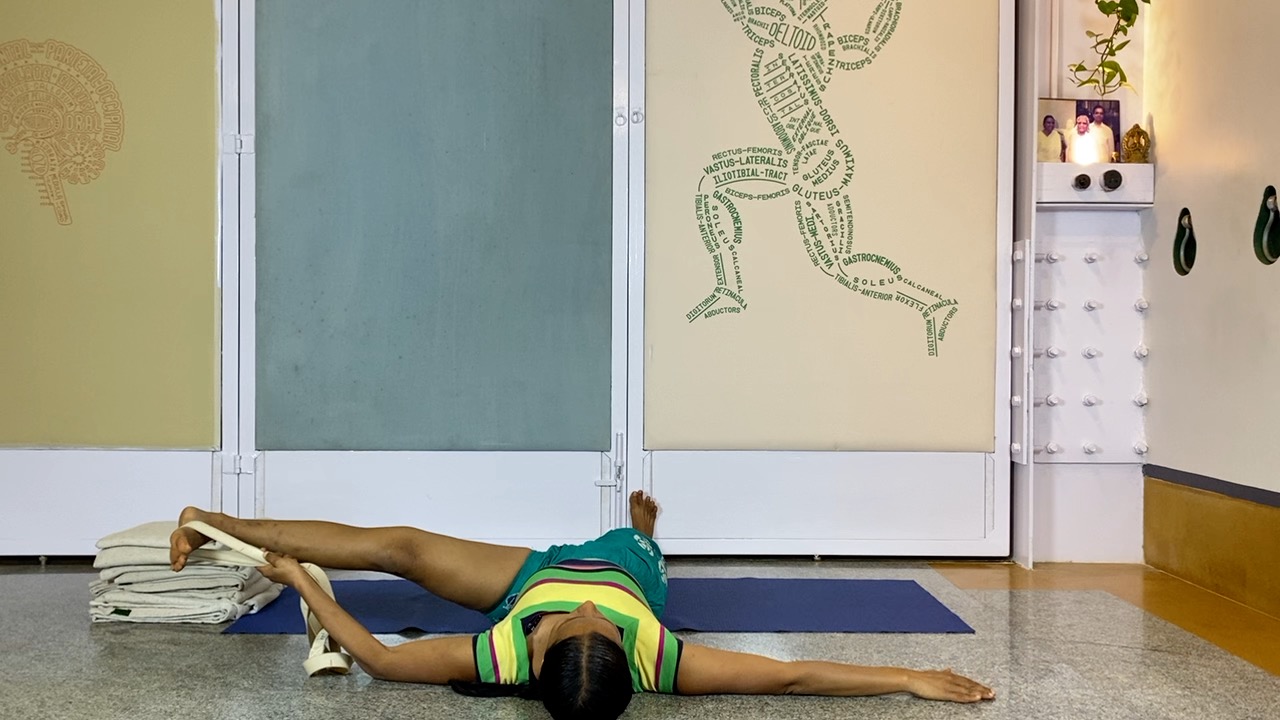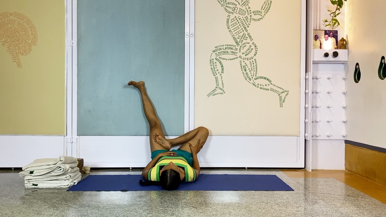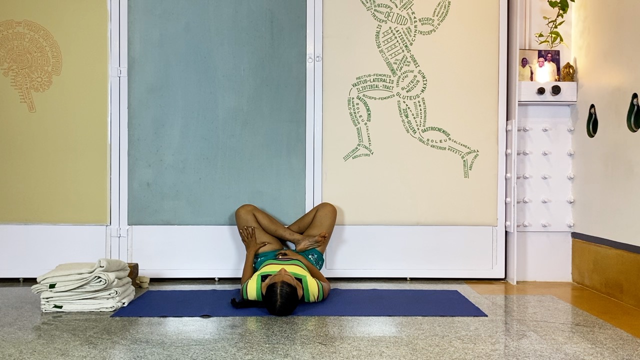 The baddhakona (literally meaning closed angle; where the thighs are rolled out, knees are flexed, and the soles of the feet touch each other evenly)  legs are usually applied in two ways in asana – in a seated position, and in a supine position.  Both baddhakonasana and  supta baddhakonasana have great therapeutic potential since they create ‘space’ in the lower abdominal pelvic area.  Think of all the organs that exist there, and the functions that they control (digestive, reproductive, urinary, hormonal centres) and the roles of these two asanas becomes obvious.  In the Iyengar tradition both these positions are used in a variety of ways, especially supta baddhakonasana is used used extensively for therapeutic, as well as for restful conditions. This is one of the essential positions that women should know for reproductive health.  Breath studies (progressing to pranayama) are often introduced in supta baddhakonasana.  There are many different ways to use supports/ props for supta baddhakonasana to accentuate its beneficial effects, or to adapt for knee/ back discomforts etc.  But for a beginner level who does not have any health complications, it is important to first understand this position (in fact all asana positions) with minimal props.