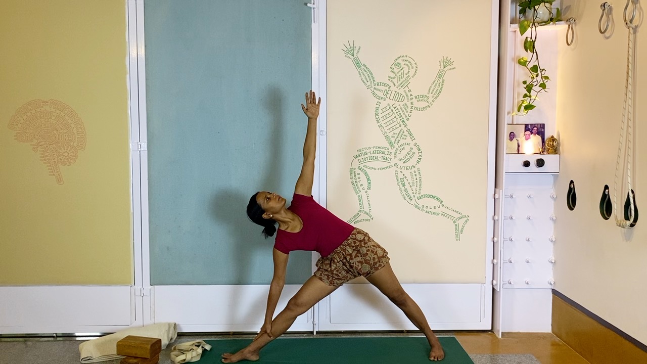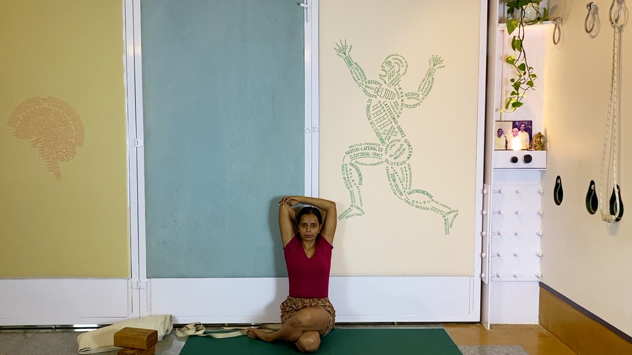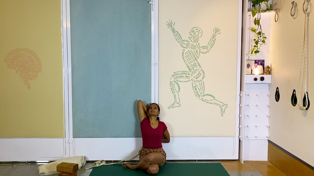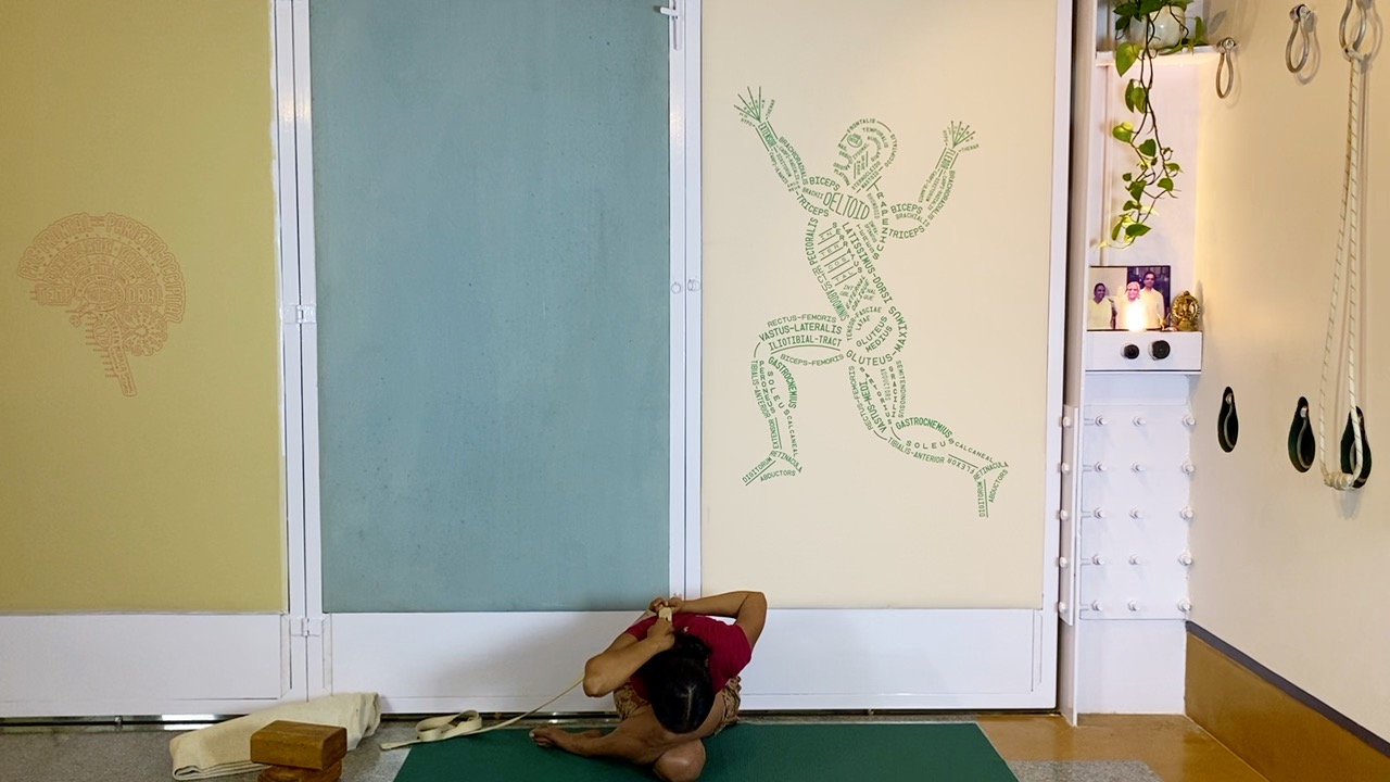 A long-ish hold in supported eka pada vipartia dandasana, after preparing the back for this position.