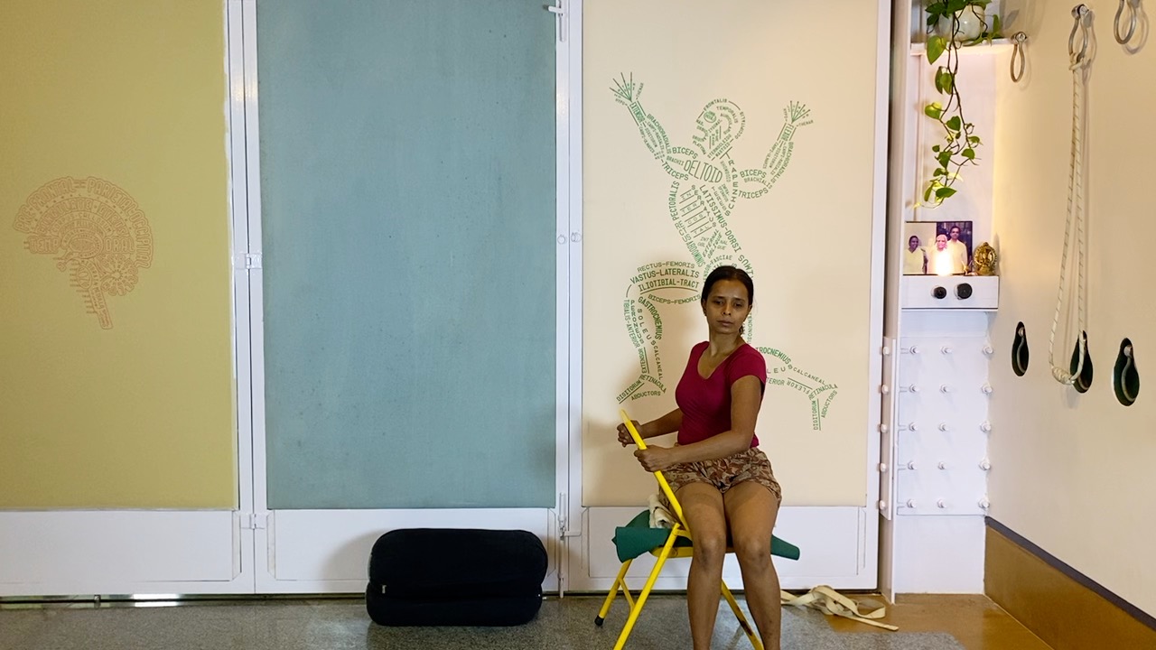 Props needed: a yoga chair, a long strap