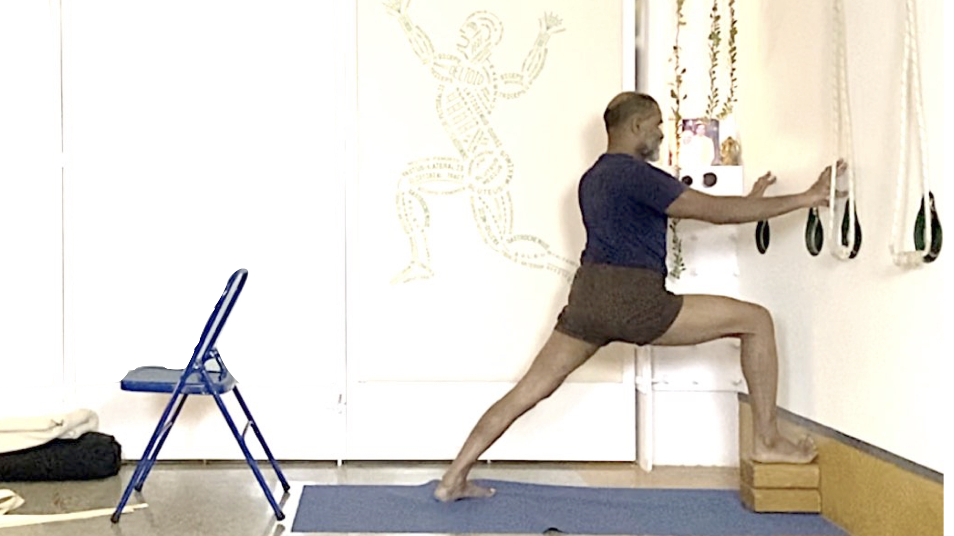 Props needed: a couple of yoga blocks, belt, a sturdy chair, access to a wall