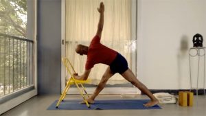 Parivrtta trikonanasa – a standing, twisting, forward extending and balancing position. Naturally, this is not an easy position to access for older practitioners, or for those in a debilitated state. This session prepares for a supported parivrtta trikonasana after ample preparations – again using supports.