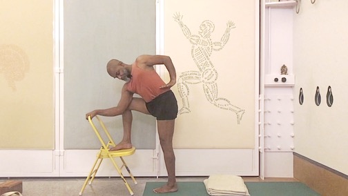 Props needed: a sturdy chair, yoga strap, a few firm blankets that can be folded and stacked to adjust the height of the seat.