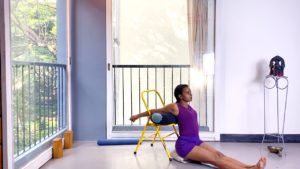 Props needed: 2 blocks, yoga strap, a sturdy chair, access to a wall, firm blankets/ bolster for adjusting the height of the seat