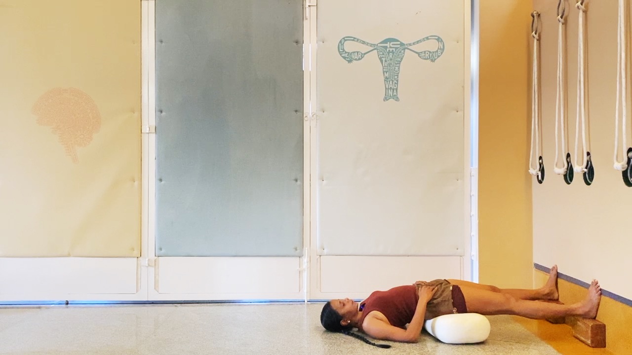 Props needed: a sturdy chair, blocks, a yoga strap, bolster, access to a wall, a couple of firm blankets
