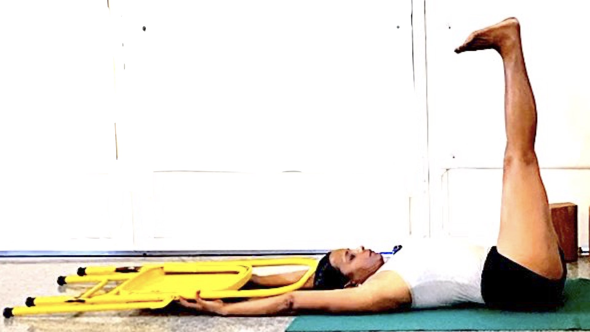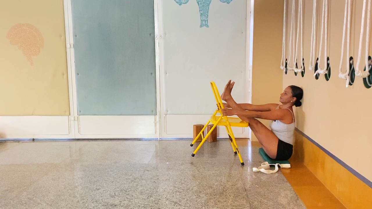 Props needed: a sturdy chair, blocks, a yoga strap, bolster, access to a wall. In this session, we also use a few objects of different shapes and weights. These need not be specialised yoga props