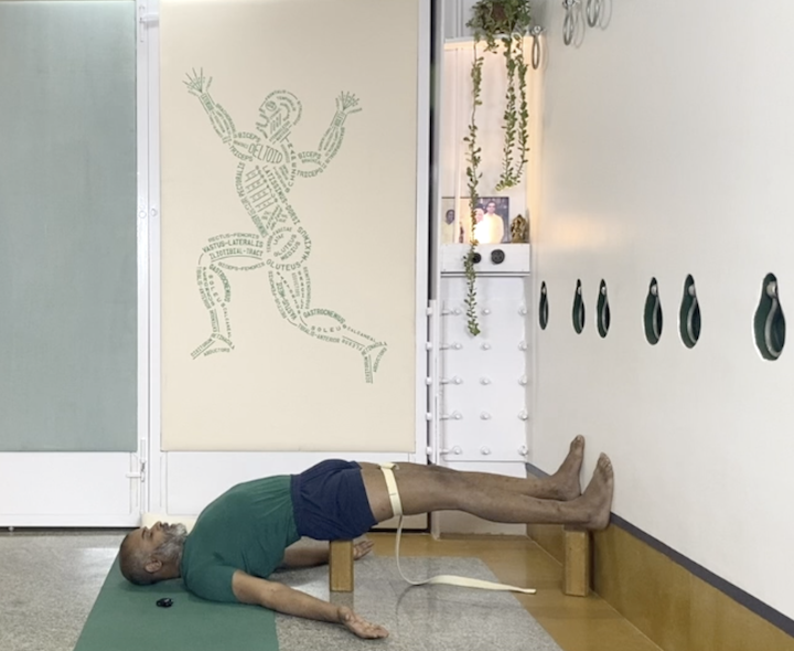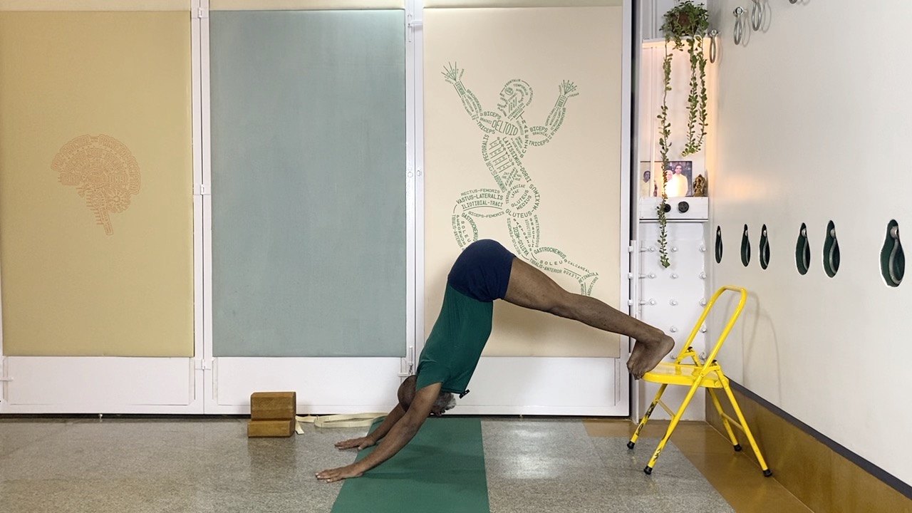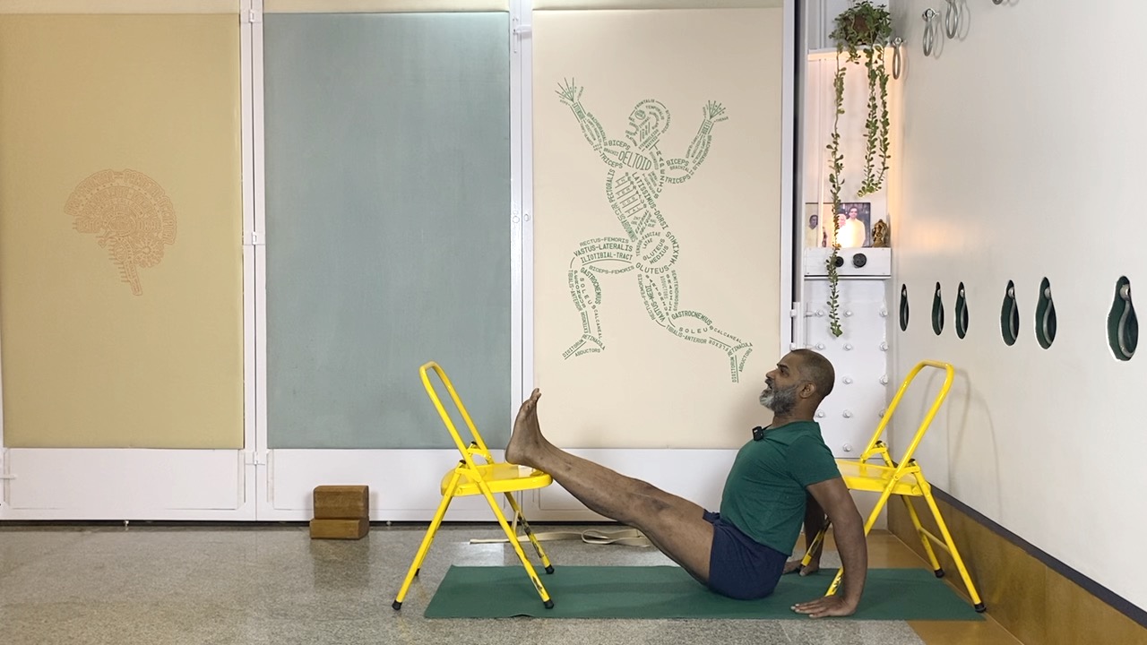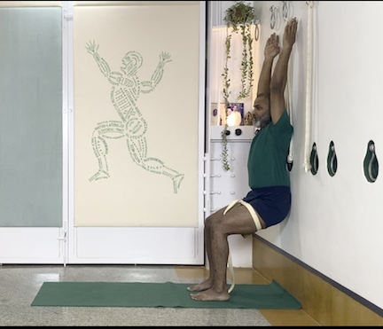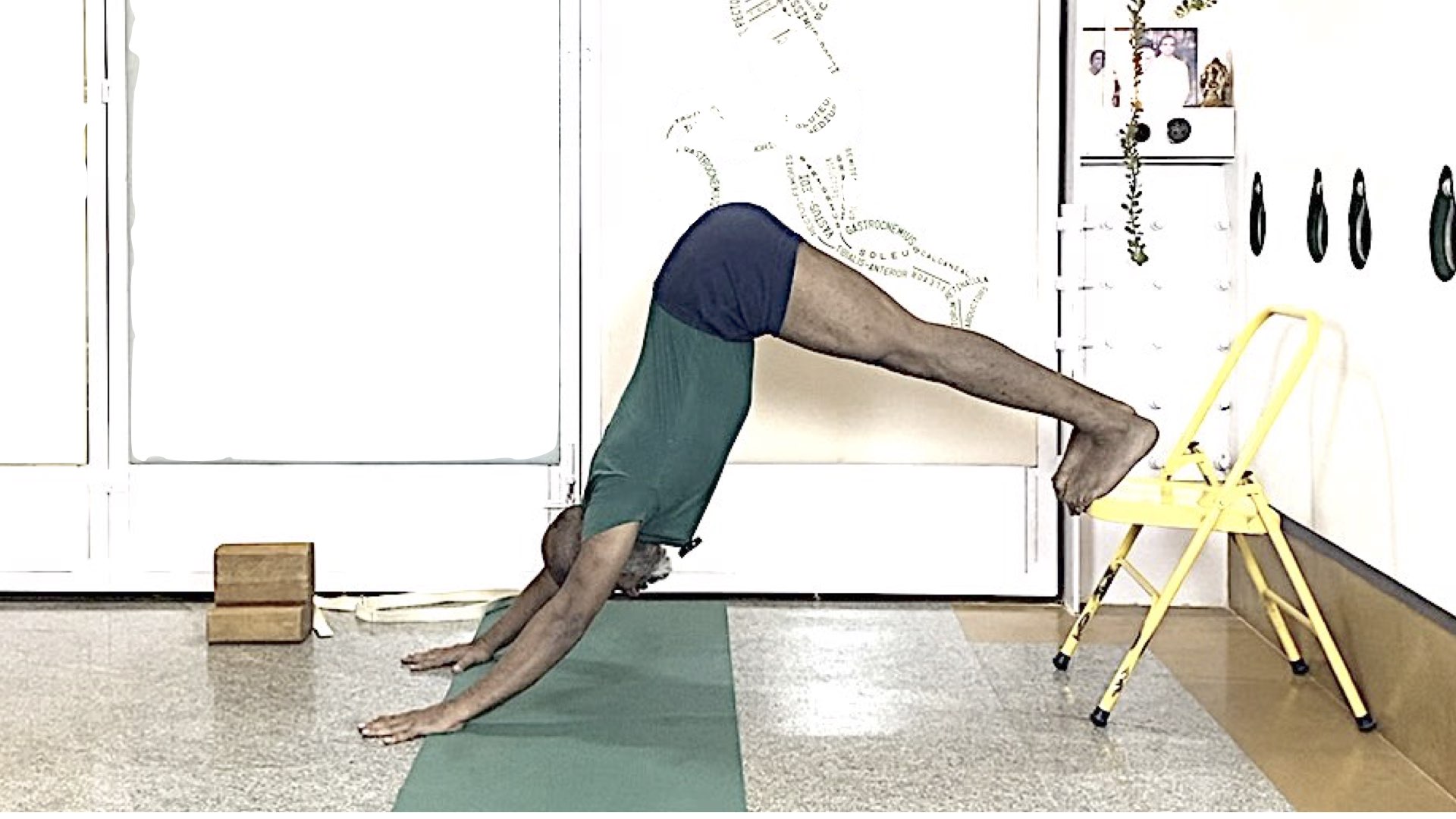 Props needed: 2 sturdy chairs/ low tables, 2 blocks, a yoga strap