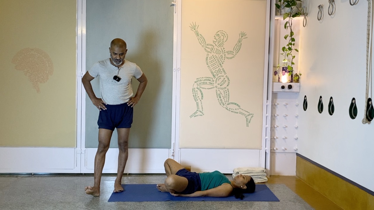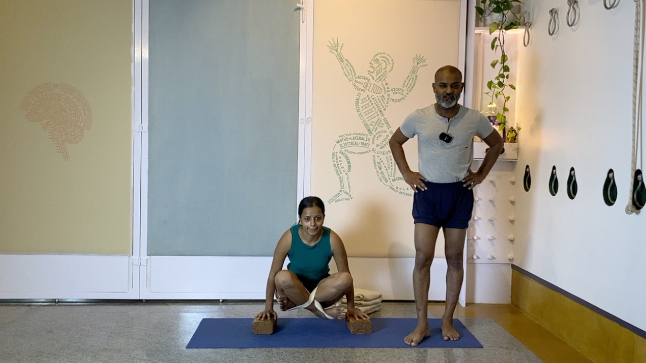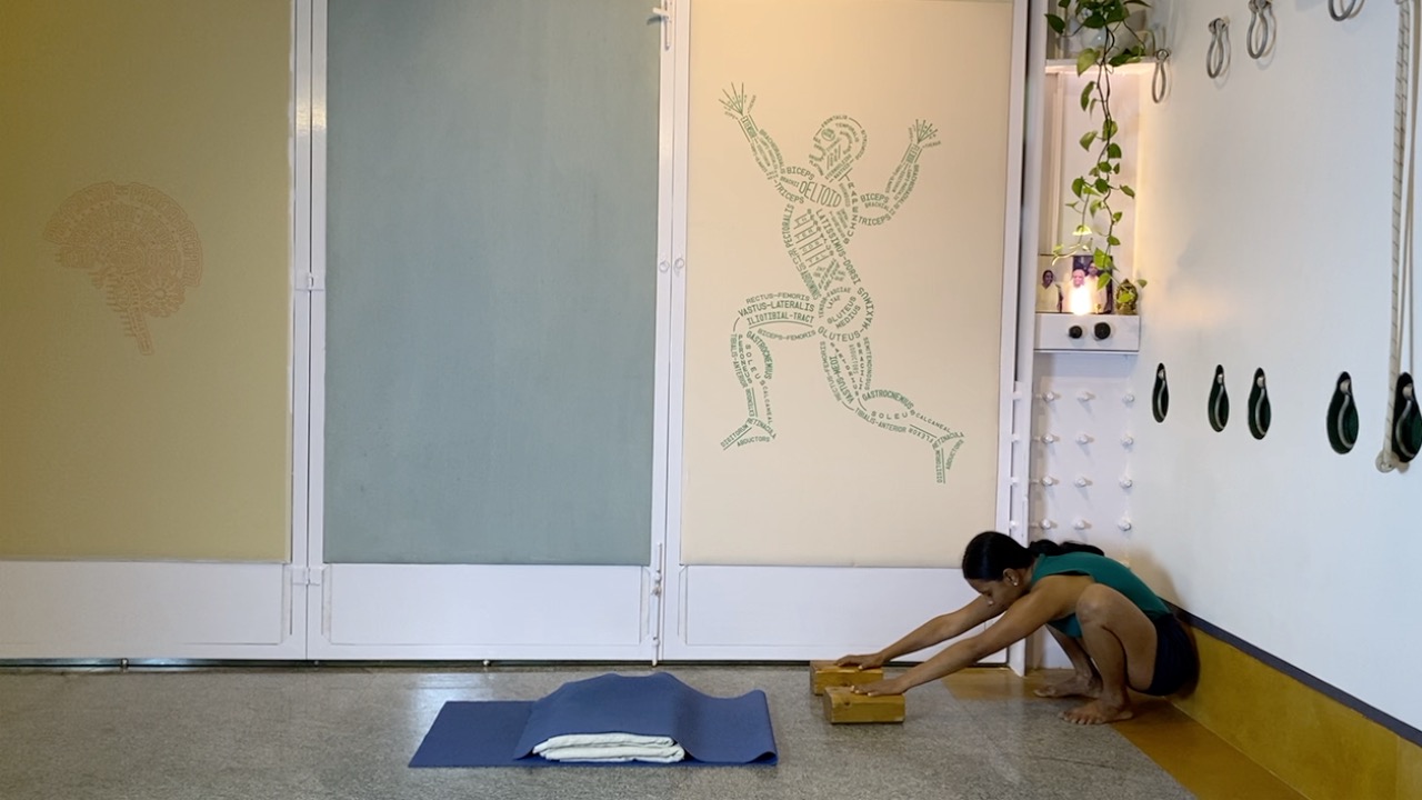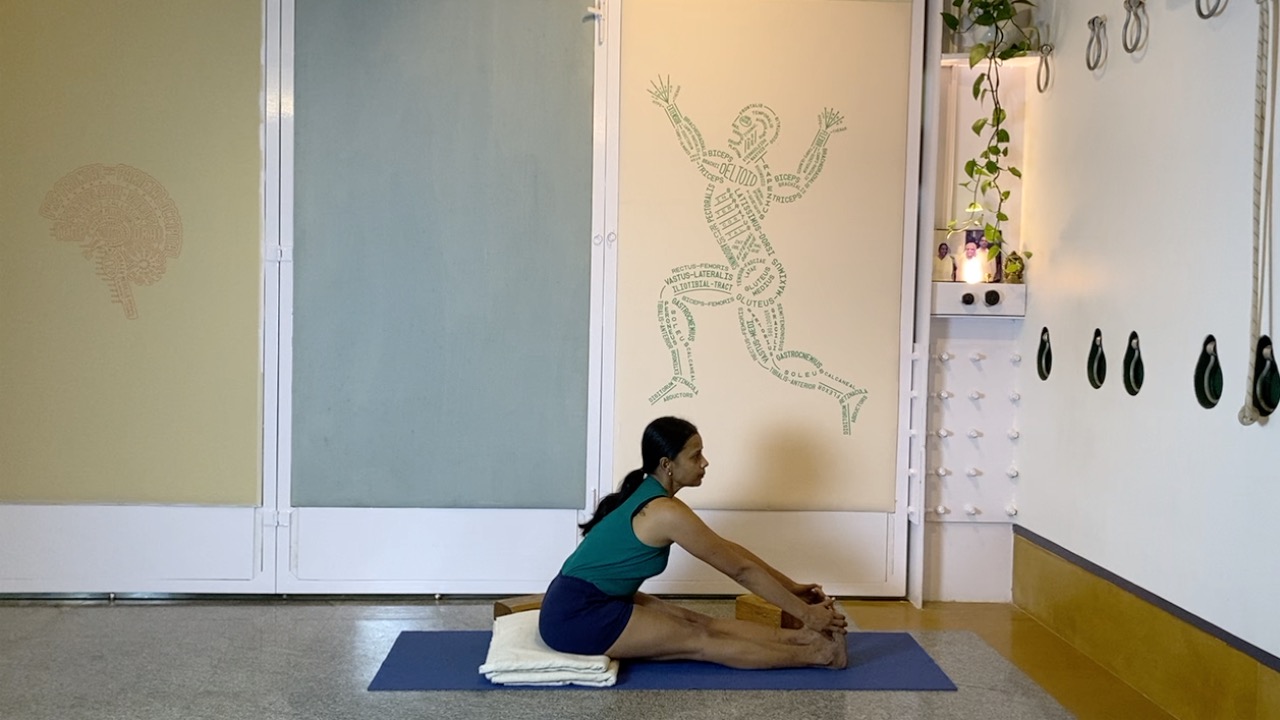 Props required: couple of blocks. yoga strap, firm blankets to adjust the height of the seat