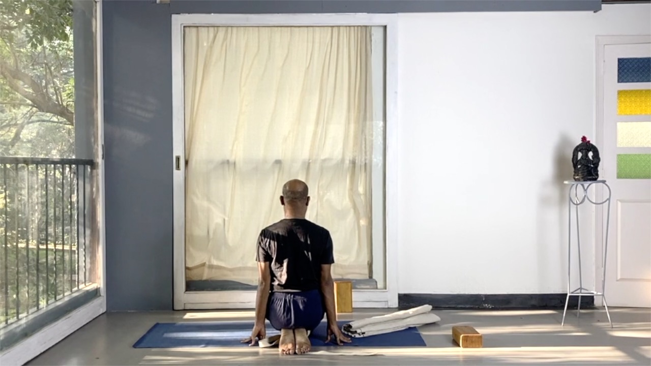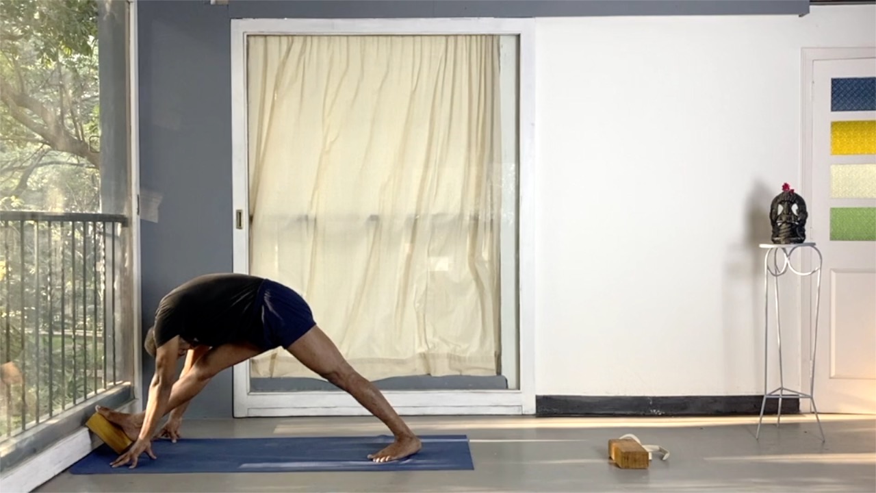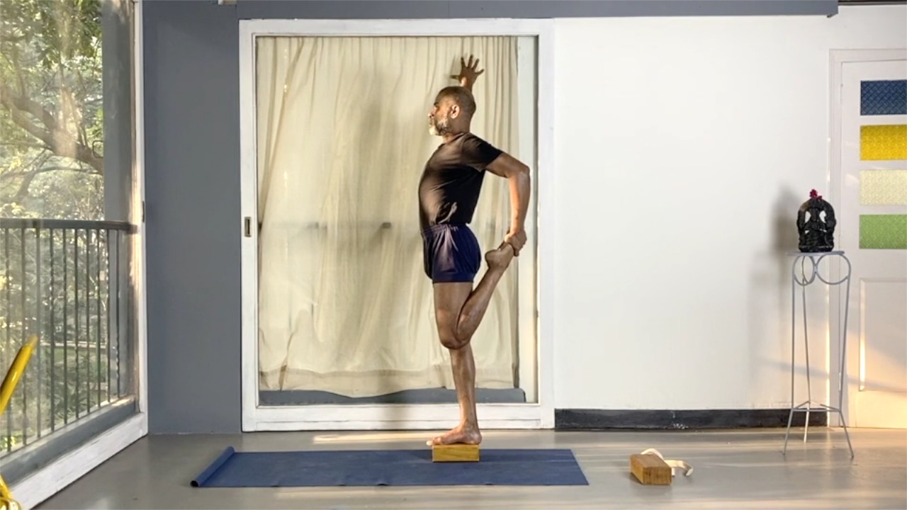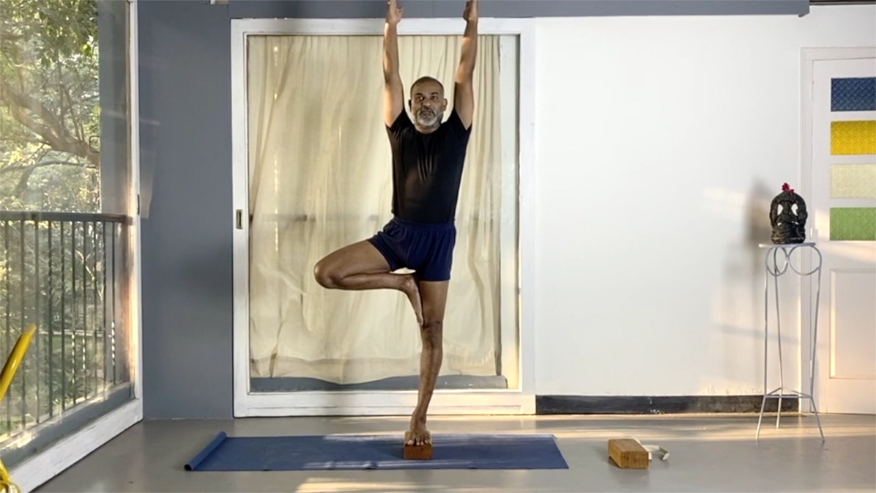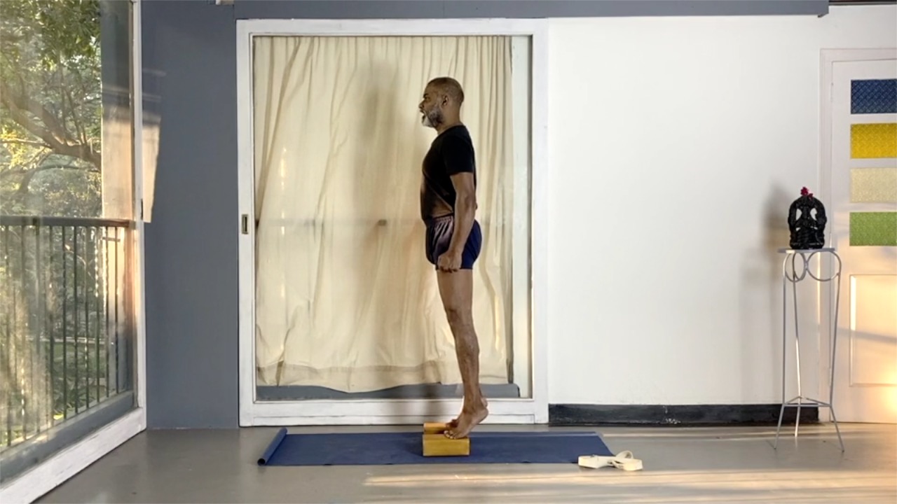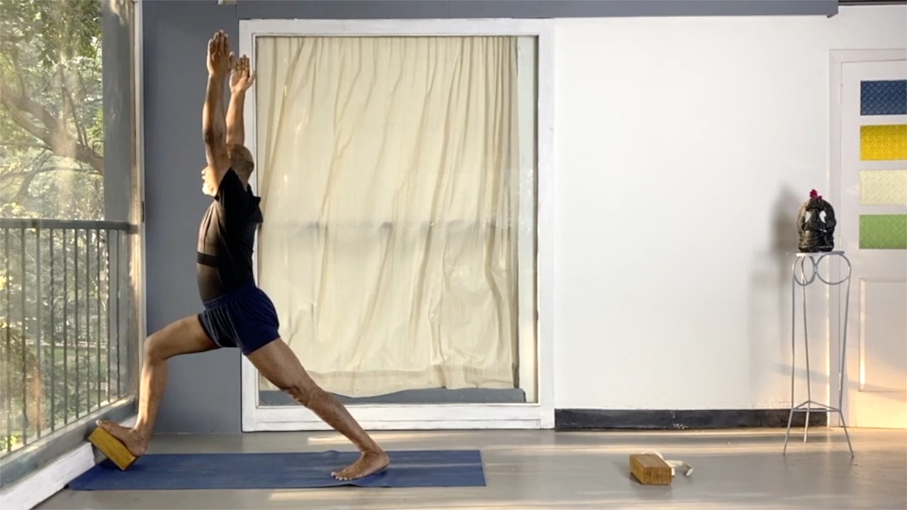 This session is a progression from the previous session. It works on the ankle joint through a series of standing asanas. Blocks are used to challenge the balance and the stability at the ankles, and also to increase the range of movements.