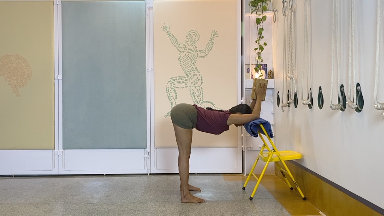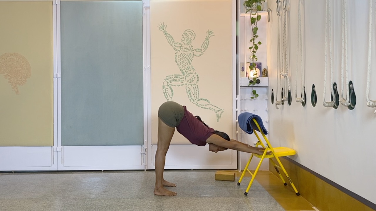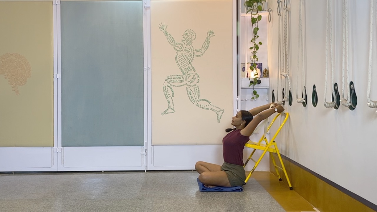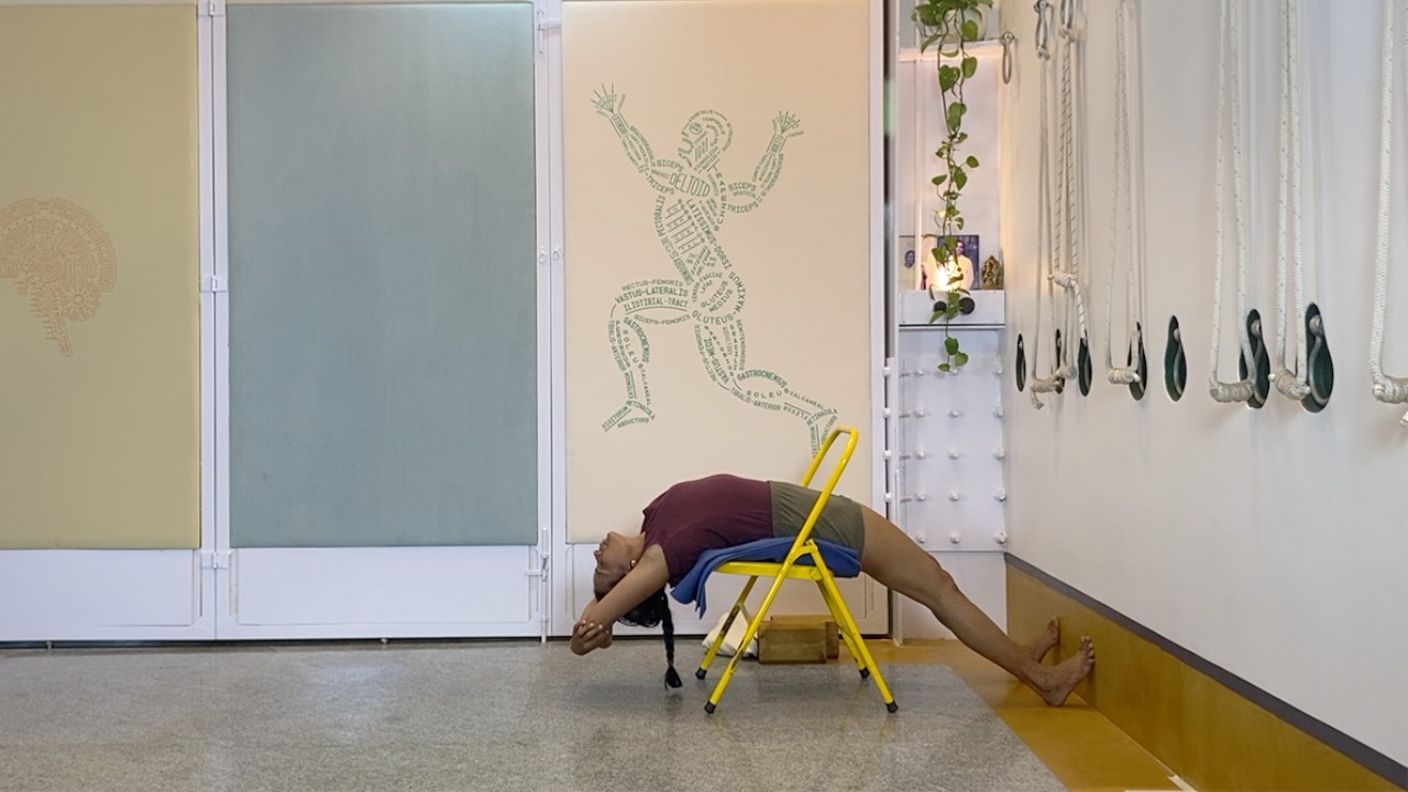 Props needed: yoga chair, yoga strap, blocks, access to a wall