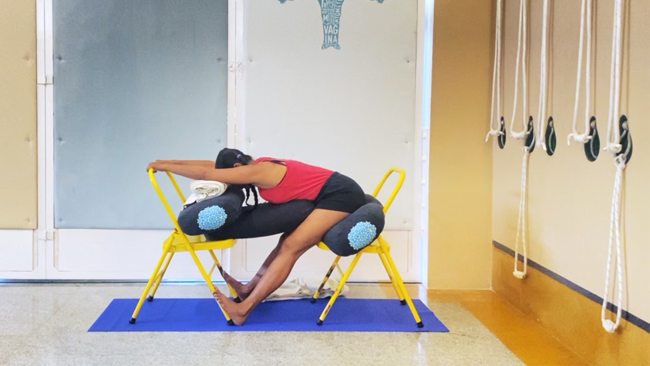 Props needed: this is prop-intensive session. A couple bolsters (or an equivalent stack of firm blankets) two blocks, a belt, a sturdy chair/ table/ bed, access to a wall, will be required.
