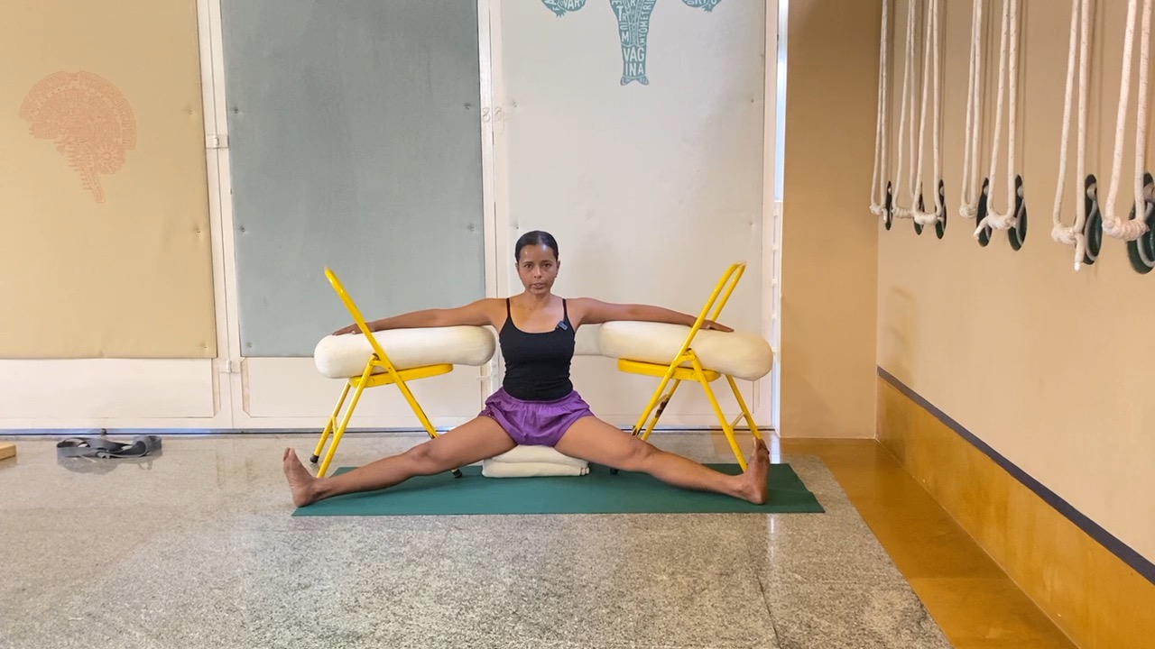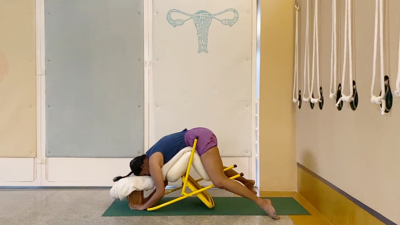 Props needed: this is prop-intensive session. A couple sturdy chairs, blocks, a yoga strap, bolster, access to a wall, 4-5 firm blankets that can stacked neatly will be needed